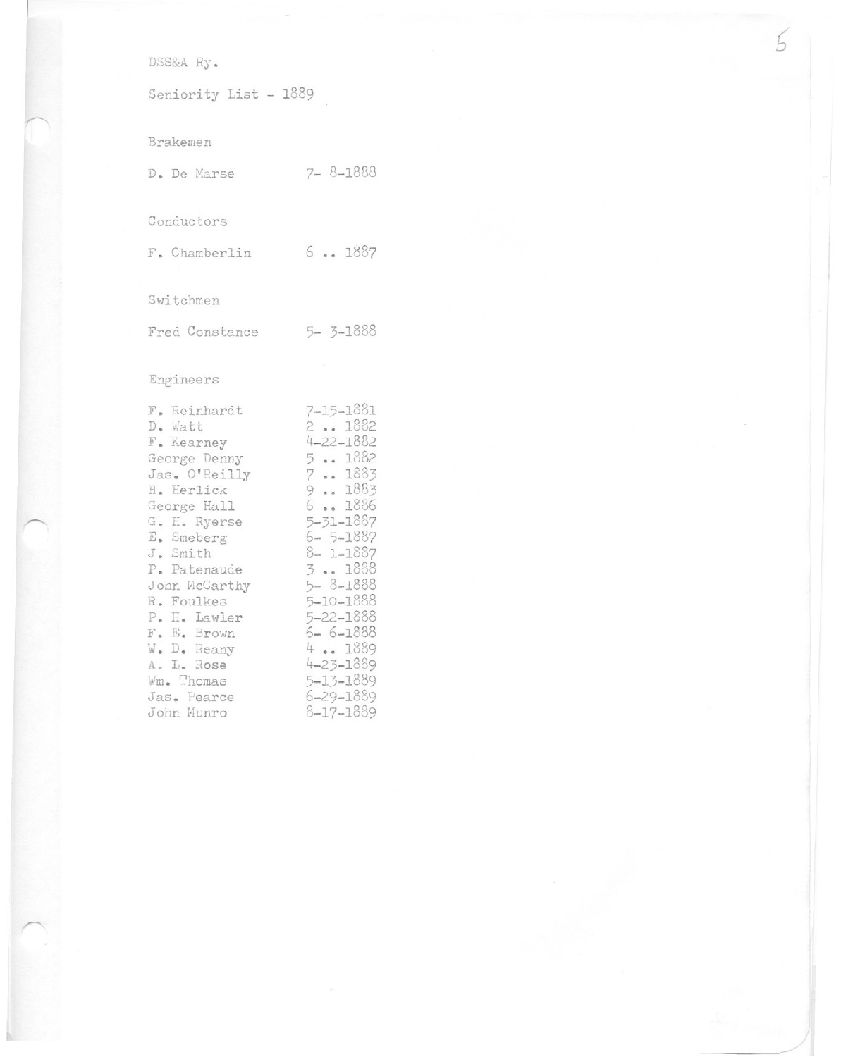 Employee Seniority list of the DSS&A Railorad for 1889: Brakemen, Conductors, Switchmen, Engineers.