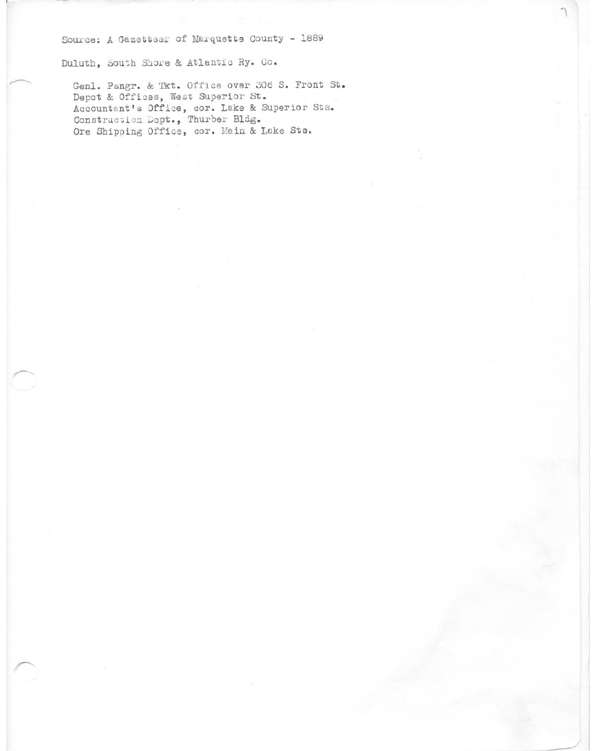 Duluth, South shore & Atlantic Railroad Company. General Passenger Office over 306 South Front Street. Depot & Offices, West Superior Street. Construction Department, Thurber Building. Ore shipping office, Main & Lake Streets.