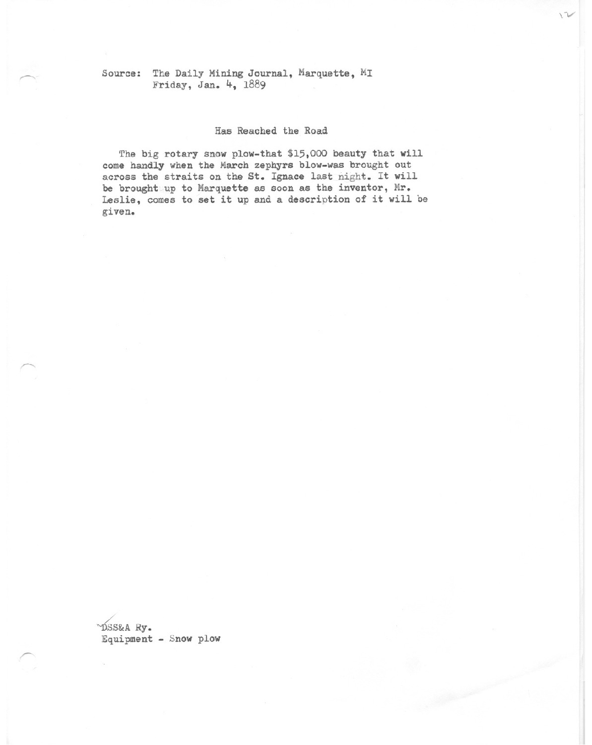 Big rotary snow plow that $15,000 beauty that will come handly when the March zephyrs blow was brought out across the straits on the St. Ignace last night. It will be bought up to Marquette as soon as the inventor, Mr. Leslie, comes to set it up and a description of it will be given.