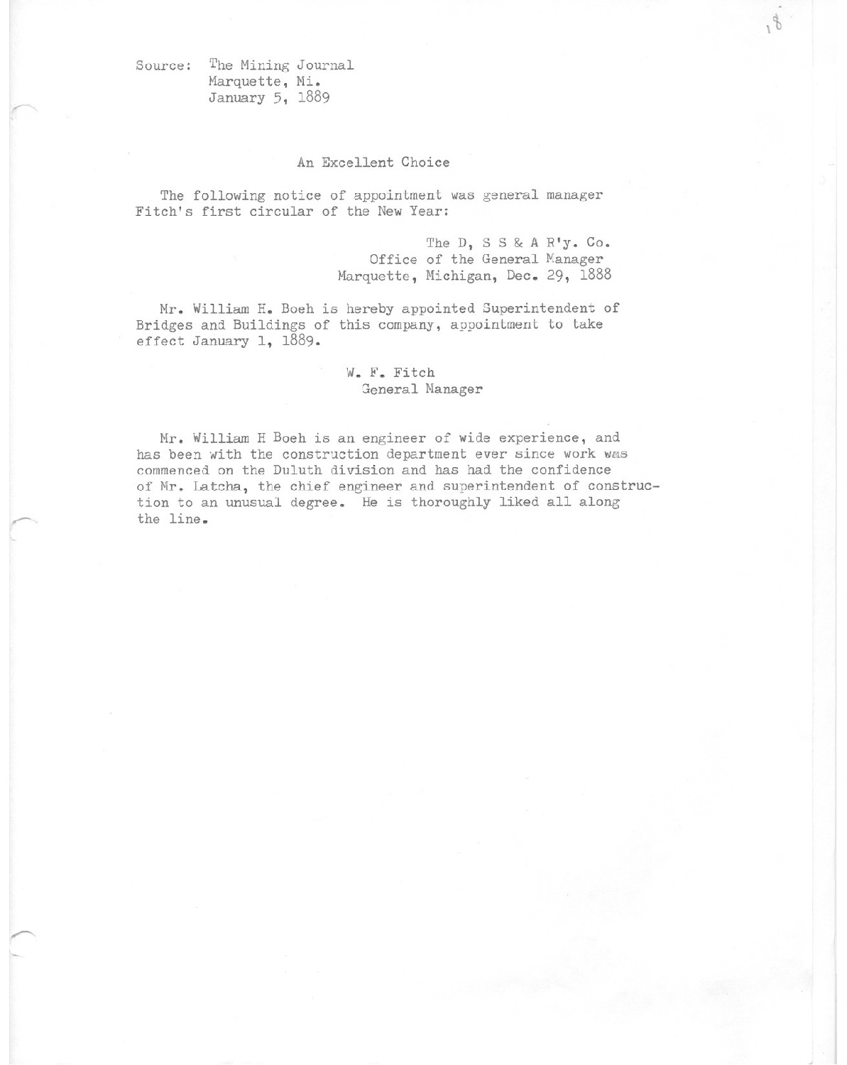 The following notice of appointment was general manager Fitch's first circular of the New Year: Mr. William H. Boeh is hereby appointed Superintendent of Bridges and Buildings of this compnay and to take effect Janurary 1, 1889.