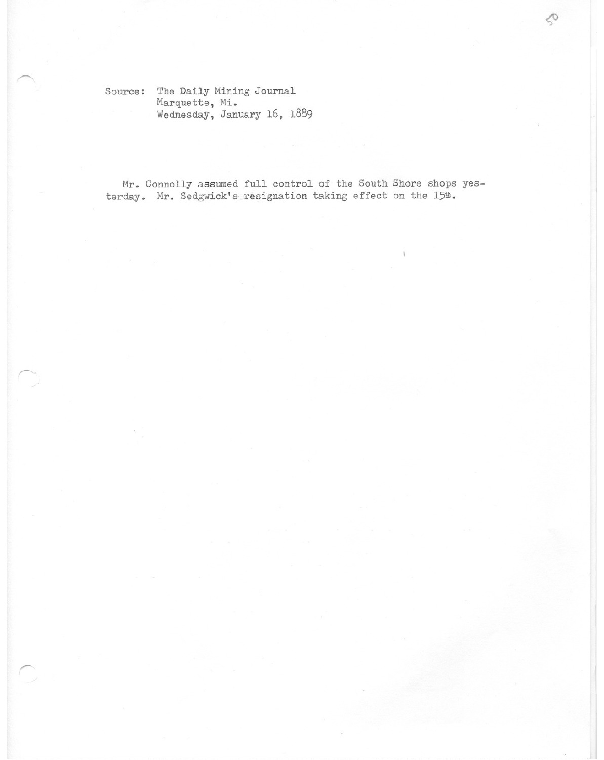 Mr. Connolly assumed full control of the South Shore shops yesterday. Mr. Sedgwick's resignation taking effect on the 15th.