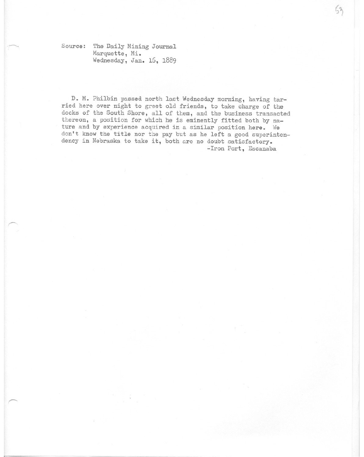 D. M. Philbin passed north last Wednesday morning, having tarried here over night to greet old friends, to make charge of the docks of the South Shore, all of them, and the business transcanted thereon, a position for which he is eminently fitted both by nature and by experience.