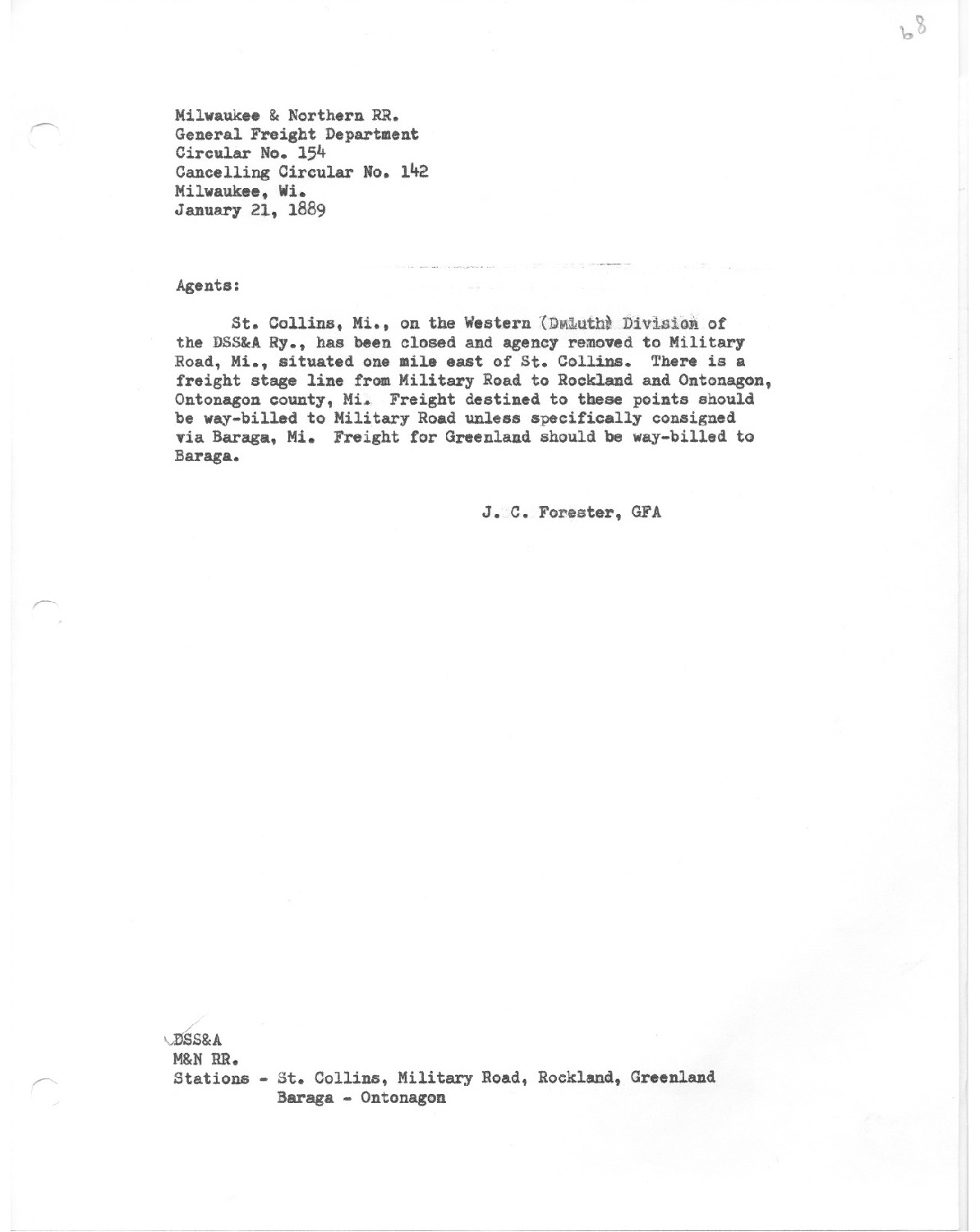 The western (duluth) divison of the DSS&A Railroad has been closed and agency removed to Miliary Road situated one mile east of St. Collins Michigan.