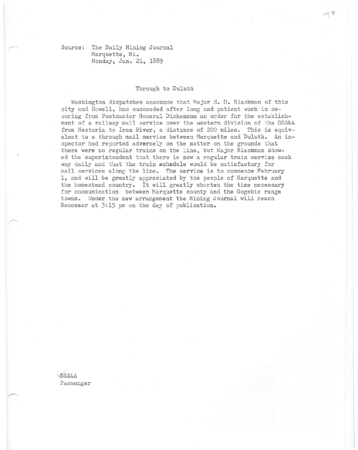 Washington dispatches announce that Major H. D. Blackman of this city and Howell, has succeeded after long and patient work in securing from Postmaster General Dickenson an order for the establishment of a railway mail service over the western division of the DSS&A from Nestoria to Iron River, a distance of 200 miles.