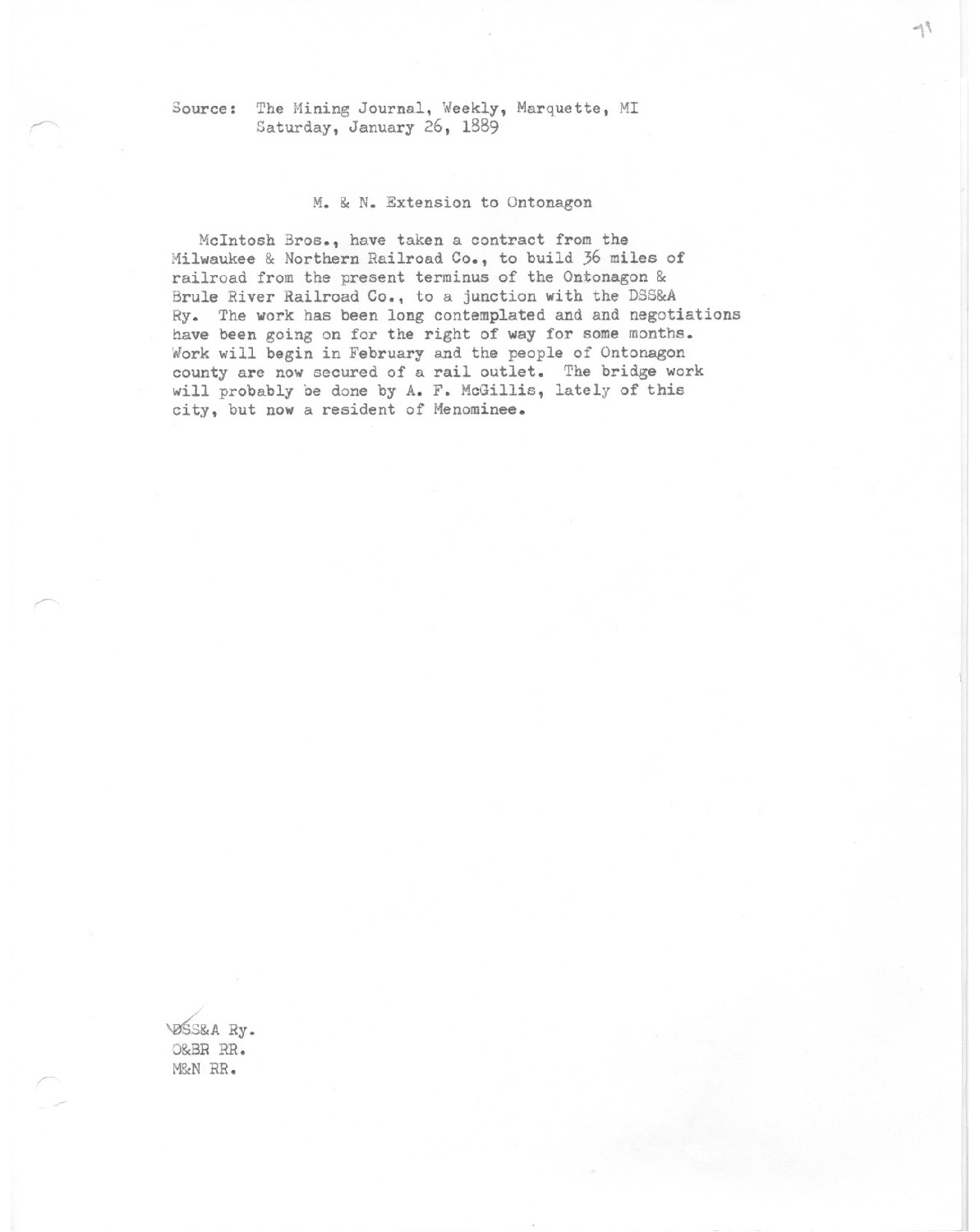 McIntosh Brothers has taken a contract from the Milwaukee & Northern Railroad Company to build 36 miles of railroad from the present terminus of the Ontonagon & Brule River Railroad Company.