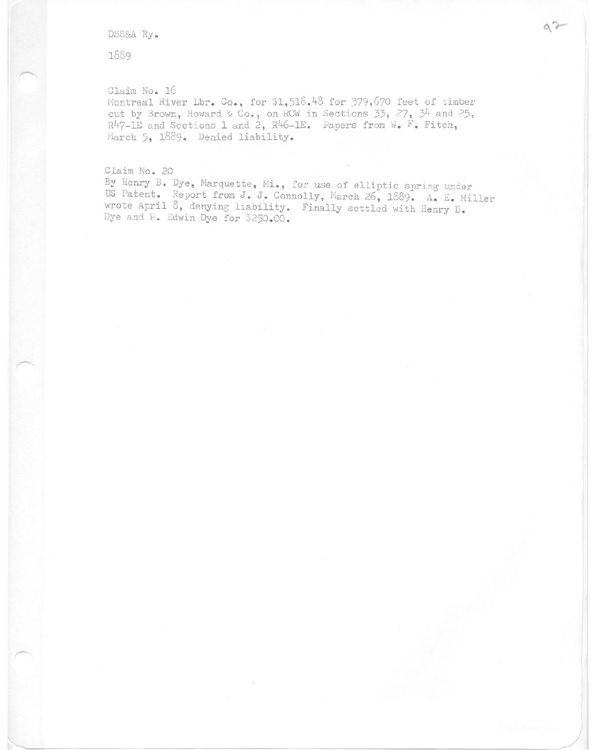 Montreal River Lumber Company for $1,518.48 for 379,670 feet of timber cut by Brown, Howard and company on ROW in sections 23, 34, 25, R47-1R and sections 1 & 2, R46-1E. Papers from W. F. Fitch, March 5, 1889. Denied Liablity. Claim No 20-By Henry B. Dye, Marquette Michigan.