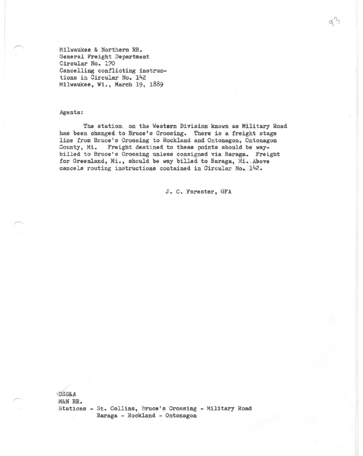 The station on the Western Division known as Military Road has been changed to Bruce's Crossing. There is a freight stage line from Bruce's Crossing to Rockland and Ontonagon Michigan.