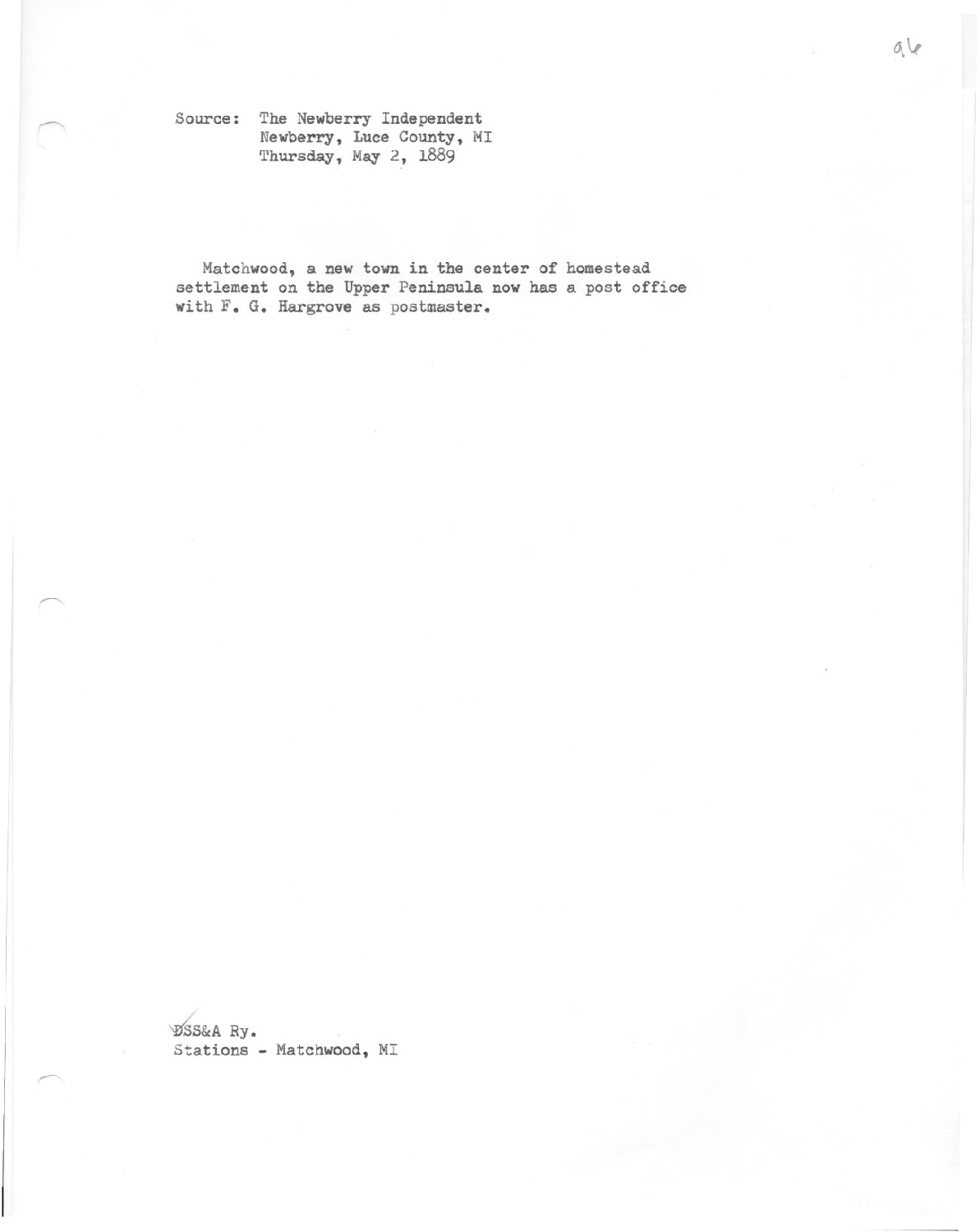 A new town in the center of homestead settlement on the Upper Peninsula now has a post office with F. G. Hargove as Postmaster.