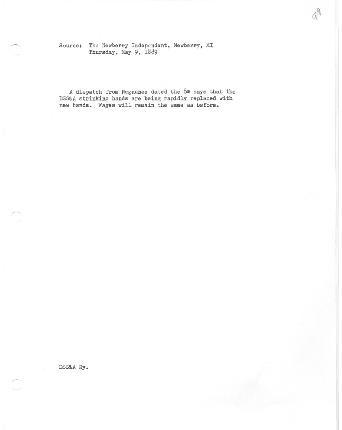 Dispatch from Negaunee dated the 8th says that the DSS&A strinking hands are being rapidly replaced with new hands. Wages will remain the same as before.