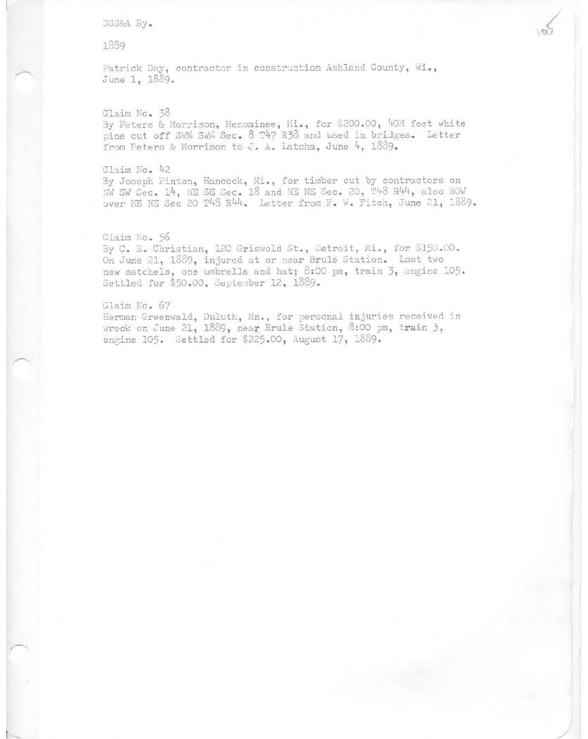 By Peters ^ Morrison, Menominee, Michigan for $200,00 40M feet white pine cut off SW1/4 Sec 8 T47 R38 and used in bridges. Claims 42, 56,67