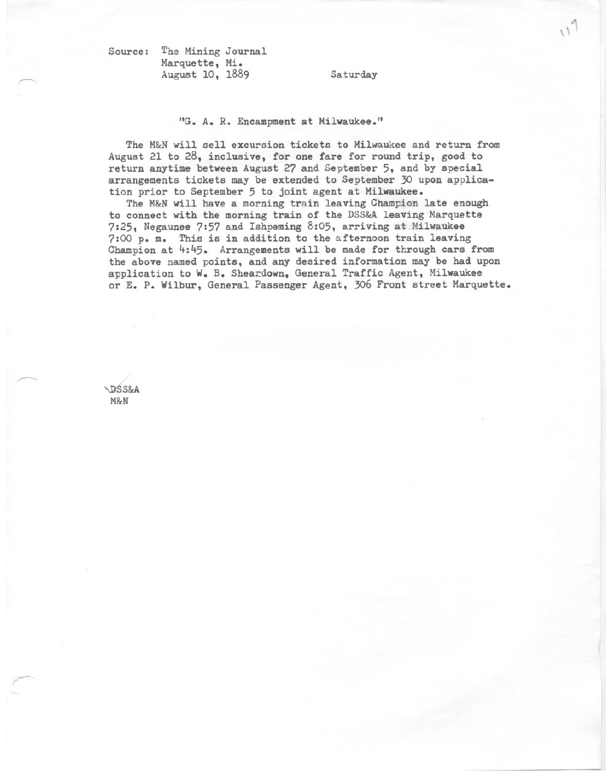 The M&N will sell excursion tickets to Milwaukee and return from August 21 to 28, inclusive for one fare for round trip, good to return anytime between August 27 and September 5.