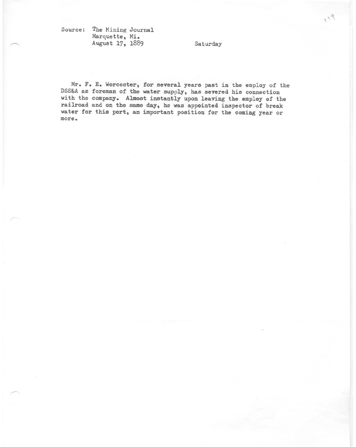 Mr. F. E. Worceser, for several years past in the employ of the DSS&A as foreman of the water supply, has severed his connection with the company. Almost instantly upon leaving the employ of the railroad and on the same day, he was appointed inspector of break water for this port, an important position for the coming year or more.