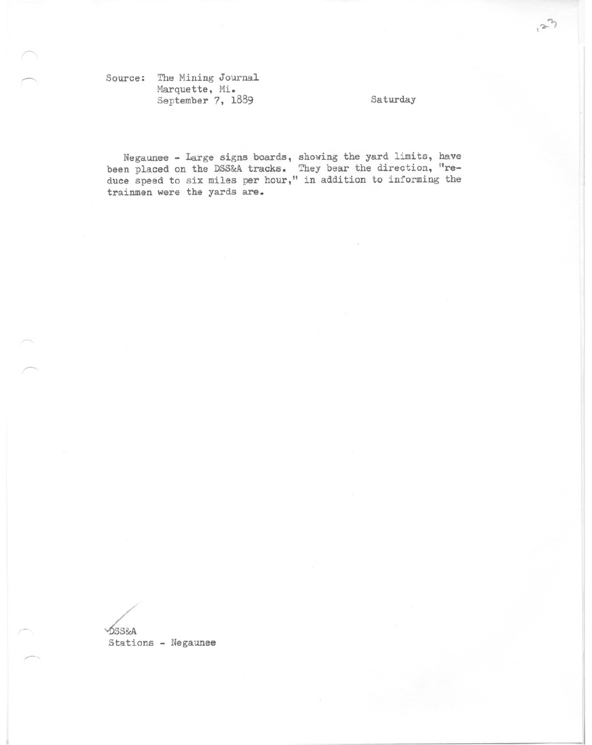 Large signs, boards, showing the yard limits have been placed on the DSS&A tracks. They bear the direction, reduce speed to six miles per hour, in addition to informing the trainmen were the yards are.
