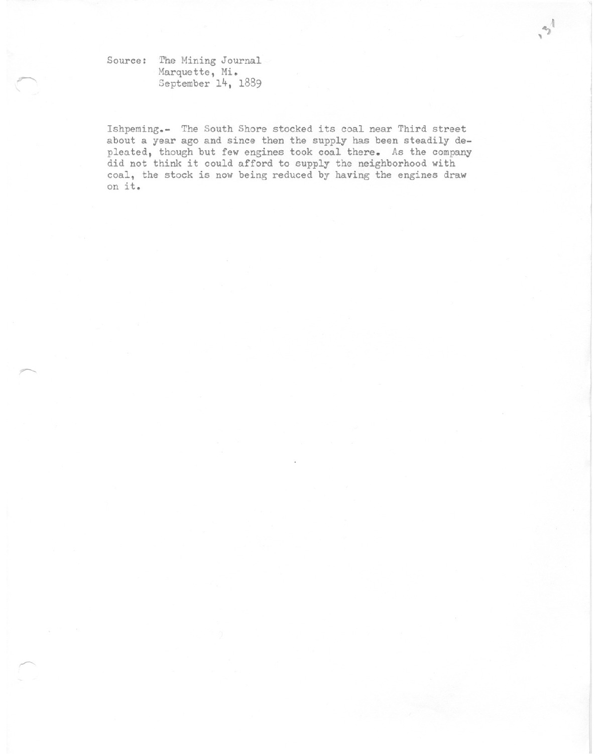 The South Shore stocked its coal near third street about a year ago and since than the supply has been steadily depleated, though but few engines took coal there. As the company did not think it could afford to supply the neighborhood with coal, the stock is now being reduced by having the engines draw on it.