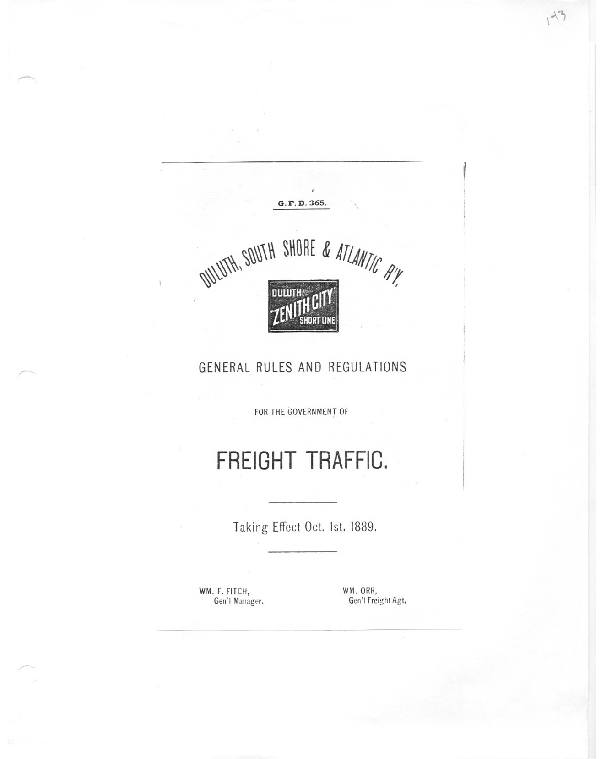 Duluth, South Shore & Atlantic Railroad. General rules and Regulations for the government of Freight traffic. Taking effect, October 1, 1889.