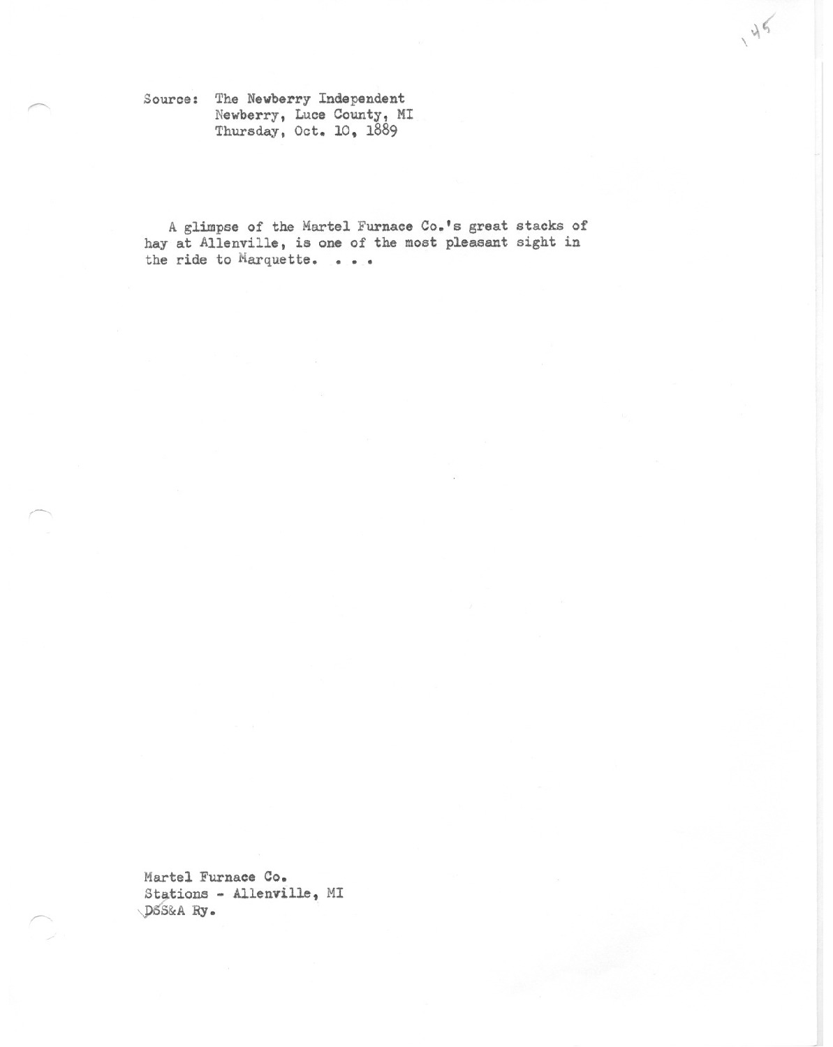 A glimpse of the Martel Furnace Companys great stacks of hay at Allenville, is one of the most pleasant sights in the ride to Marquette.