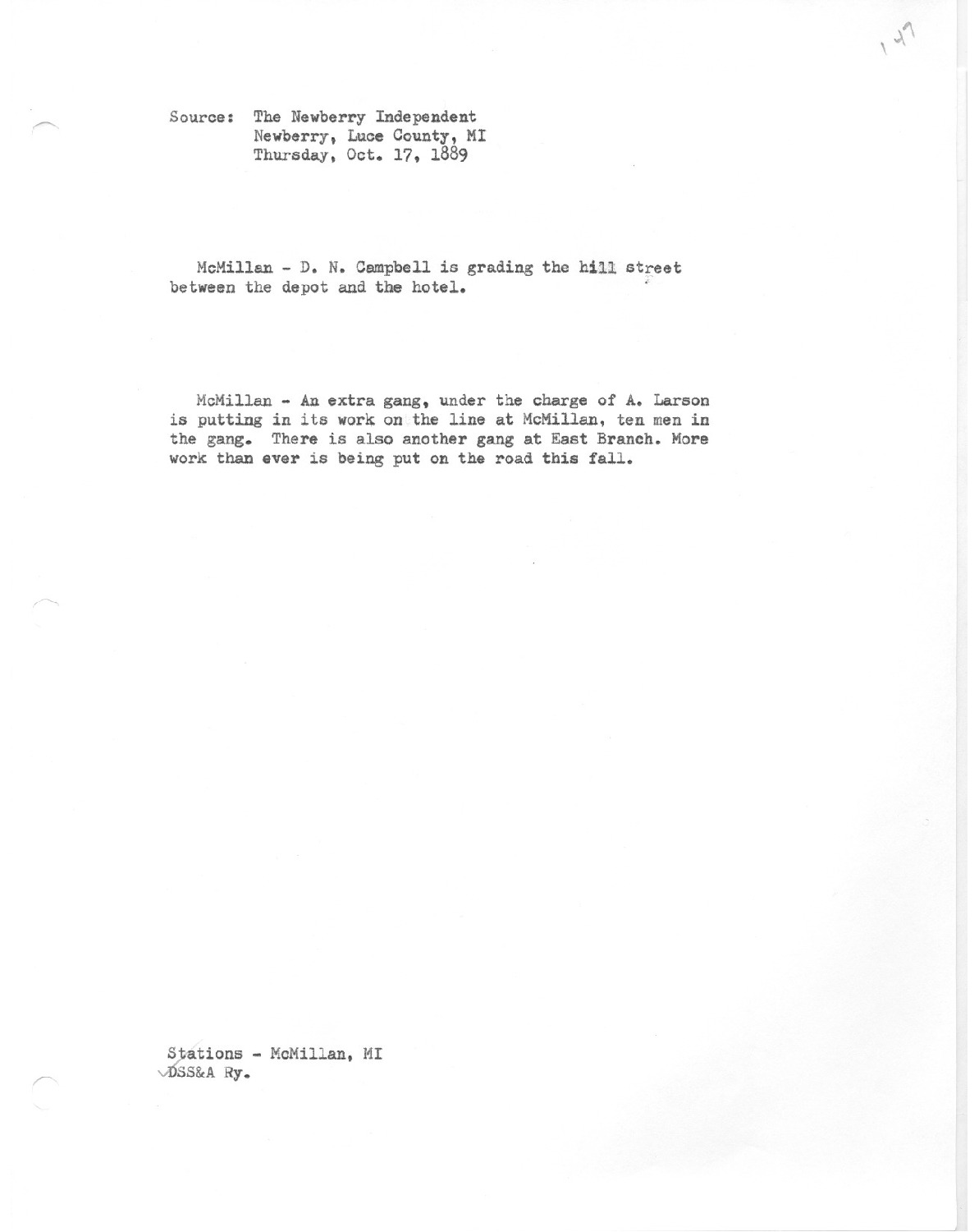An extra gang under the charge of A. Larson is putting in its work on the line at McMillian, ten men in the gang. There is also another gang at east branch more than ever is being put on the road this fall.