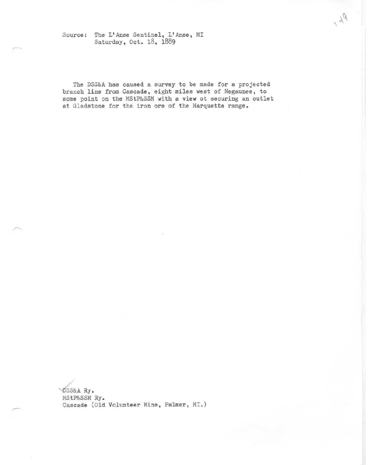 The DSS&A has caused a survey to be made for a projected branch line from Cascade, eight miles west of Negaunee, to some point on the MStP&SSM.