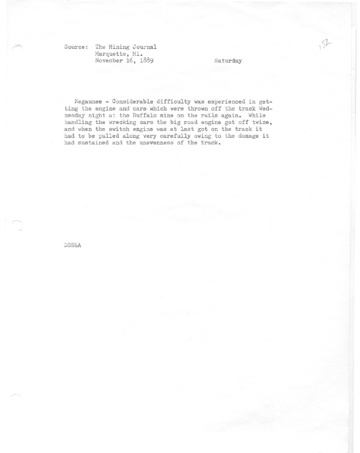 Considerable difficulty was experienced in getting the engine and cars which were thrown off the track Wednesday night at the Buffalo mine on the rails again.