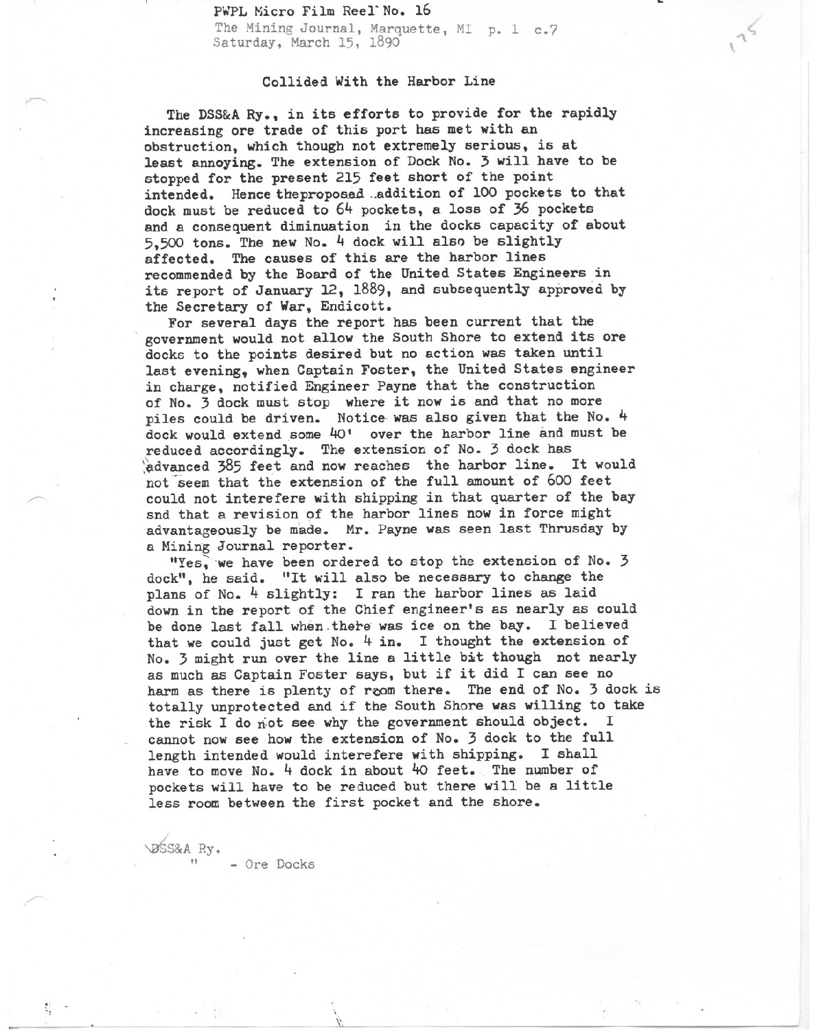 The DSS&A Railroad in its effects to prive for the rapidly increasing ore trade of this port has met with an obstruction, which through not extremely serious is at least annoying.