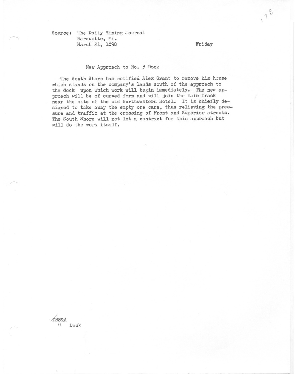 The South Shore has notified Alex Grant to remove his house which stands on the company's lands south of the approach to the dock upon which work will begin immediately. The new approach will be of cured form and will join the main track near the site of the old Northwestern Hotel. It is chiefly designed to take away the empty ore cars, thus relieving the presure and traffic at the crossing of Front and Superior streets. The South Shore will not let a contract for this approach but will do the work itself.