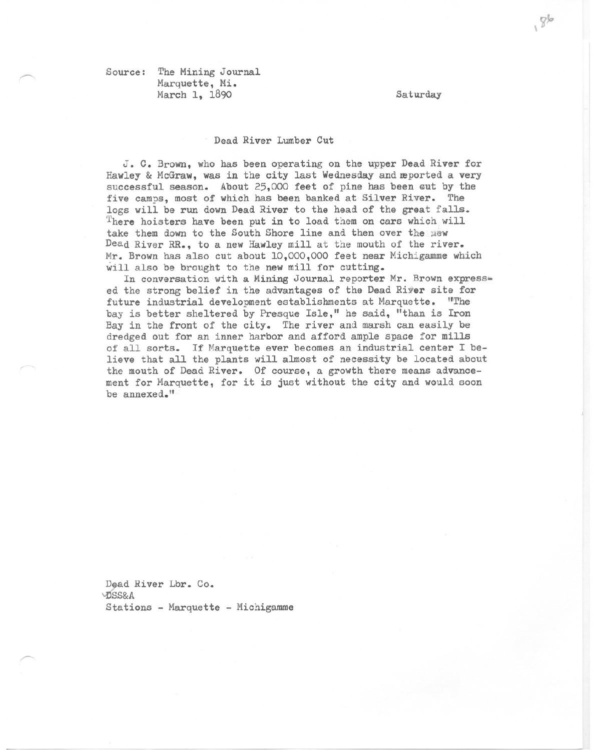 J. C. Brown who has been operating on the upper Dead River for Hawley & McGraw was in the city last Wednesday and reported a very successful season. About 25,000 feet of pine has been cut by the five camps, must of which have been banked at Silver River.