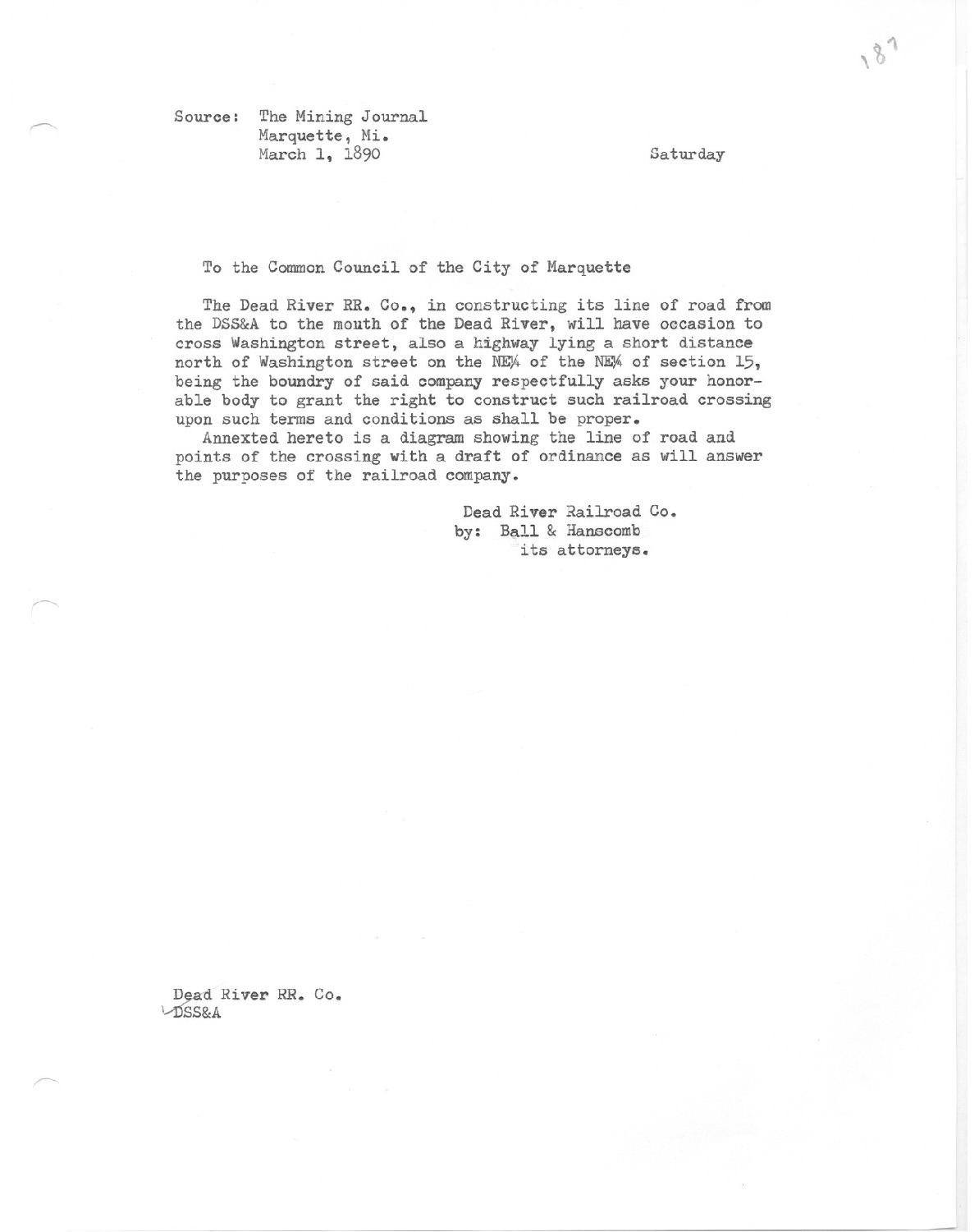 The Dead River Railroad Company is constructing its line of road from the DSS&A to the mouth of the Dead River, will have occasion to cross Washington street, also a highway lying a short distance north of Washington street on the NE1/4 of the NE1/4 of section 15.
