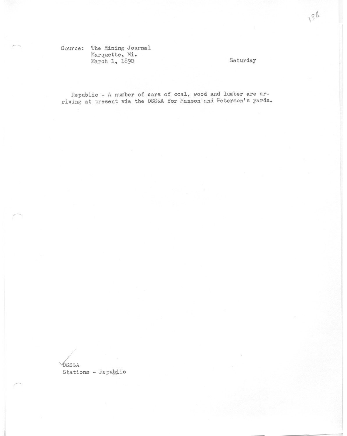 A number of cars of coal, wood and lumber are arriving at present via the DSS&A for Manson and Peterson's yards.