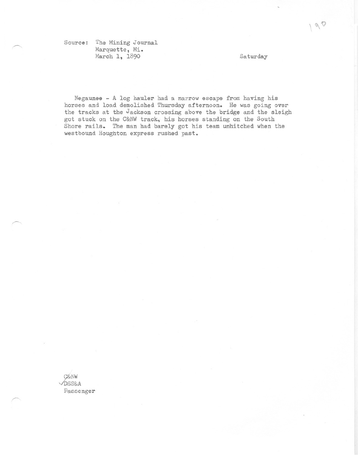 A log hauler had a narrow escape from having his horses and load demolished Thursday afternoon. He was going over the tracks at the Jackson crossing above the bridge and the sleight got stuck on the C&NW track, his horses standing on the South Shore rails. He man had barely got his team unhitched when the westbound Houghton express rushed past.