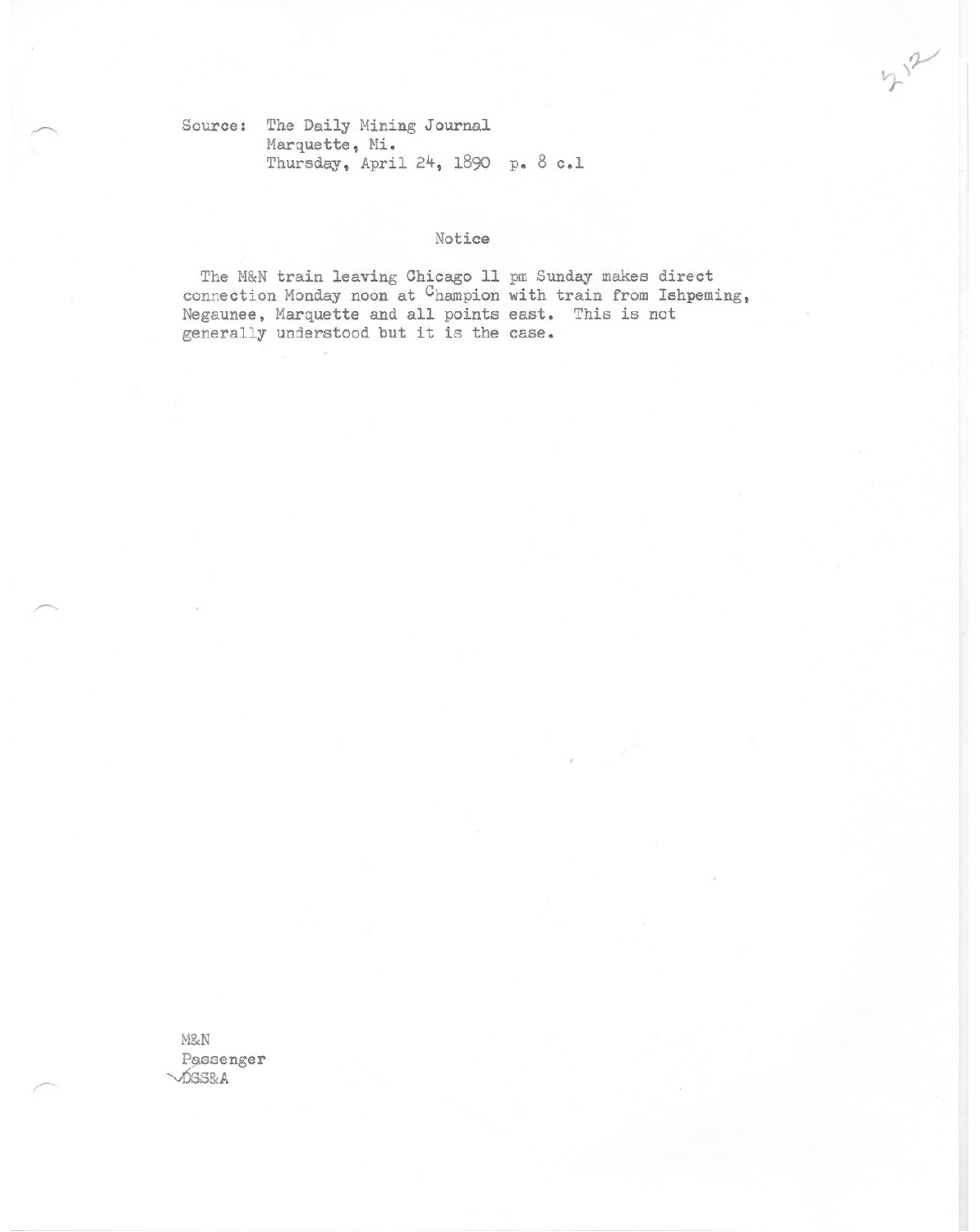 M&N Train leaving Chicago 11pm Sunday makes direct connection Monday noon at Champion with train from Isphpeming, Negaunee, Marquette and all points east. This is not generally understood but it is the case.