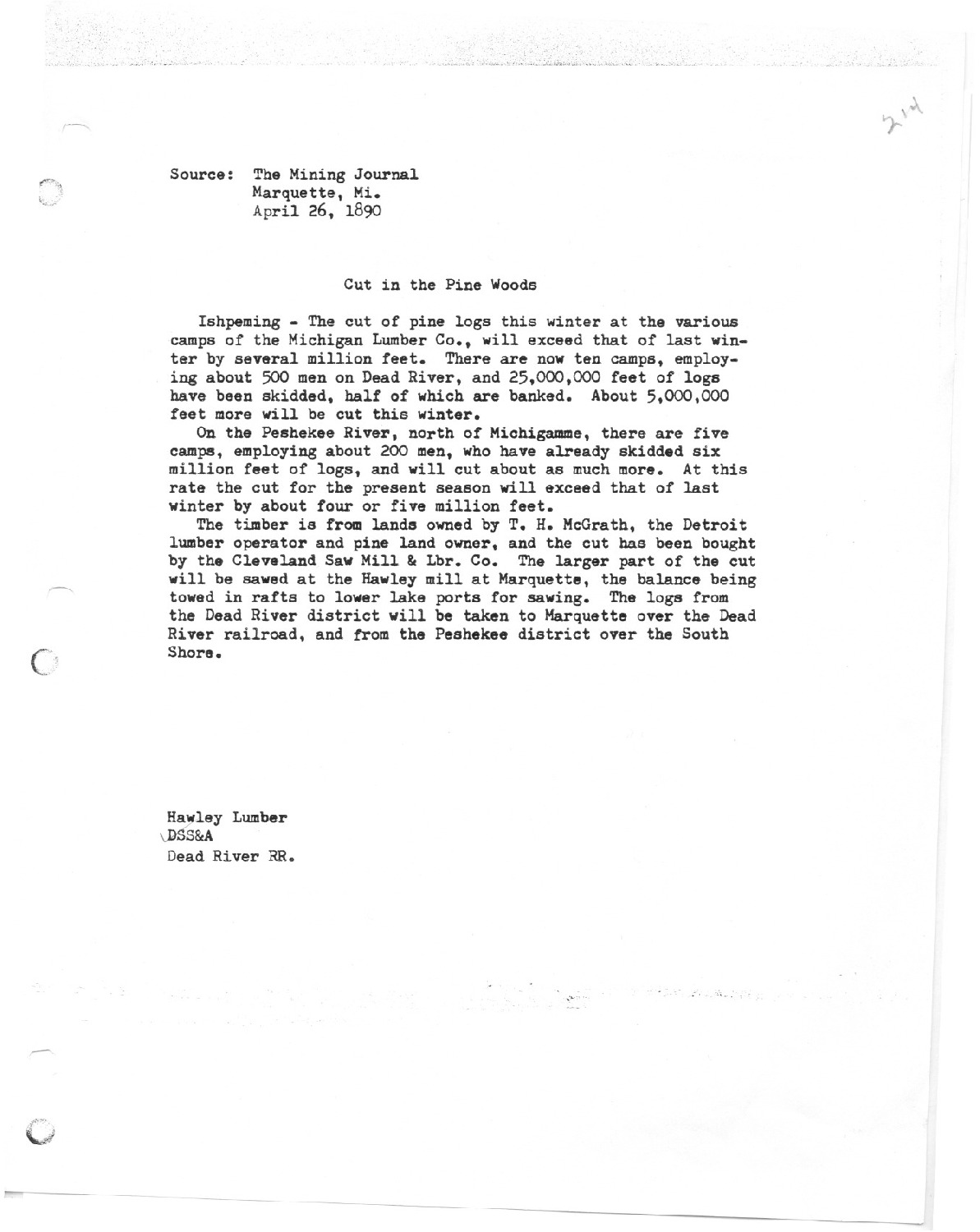 The cut of pine logs this winter at the various camps of the Michigan Lumber Company will exceed that of last winter by several million feet. There are now ten camps, employing about 500 men on the Dead River, and 25,000,000 feet of logs have been skided, half of which are banked.