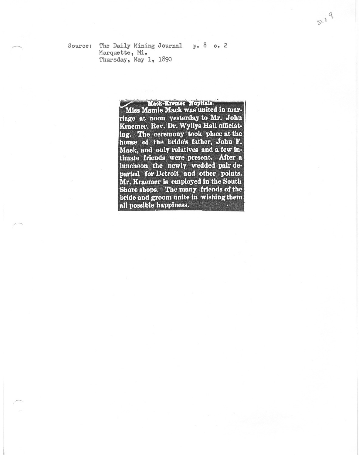 Miss Mamie Mack was united in marriage at noon yesterday to Mr. John Kraemer, Reverend Dr. Wyllys Hall officating. The ceremony took place at the house of the bride's father, John E. Mack and only relatives and few intimate friends were present.