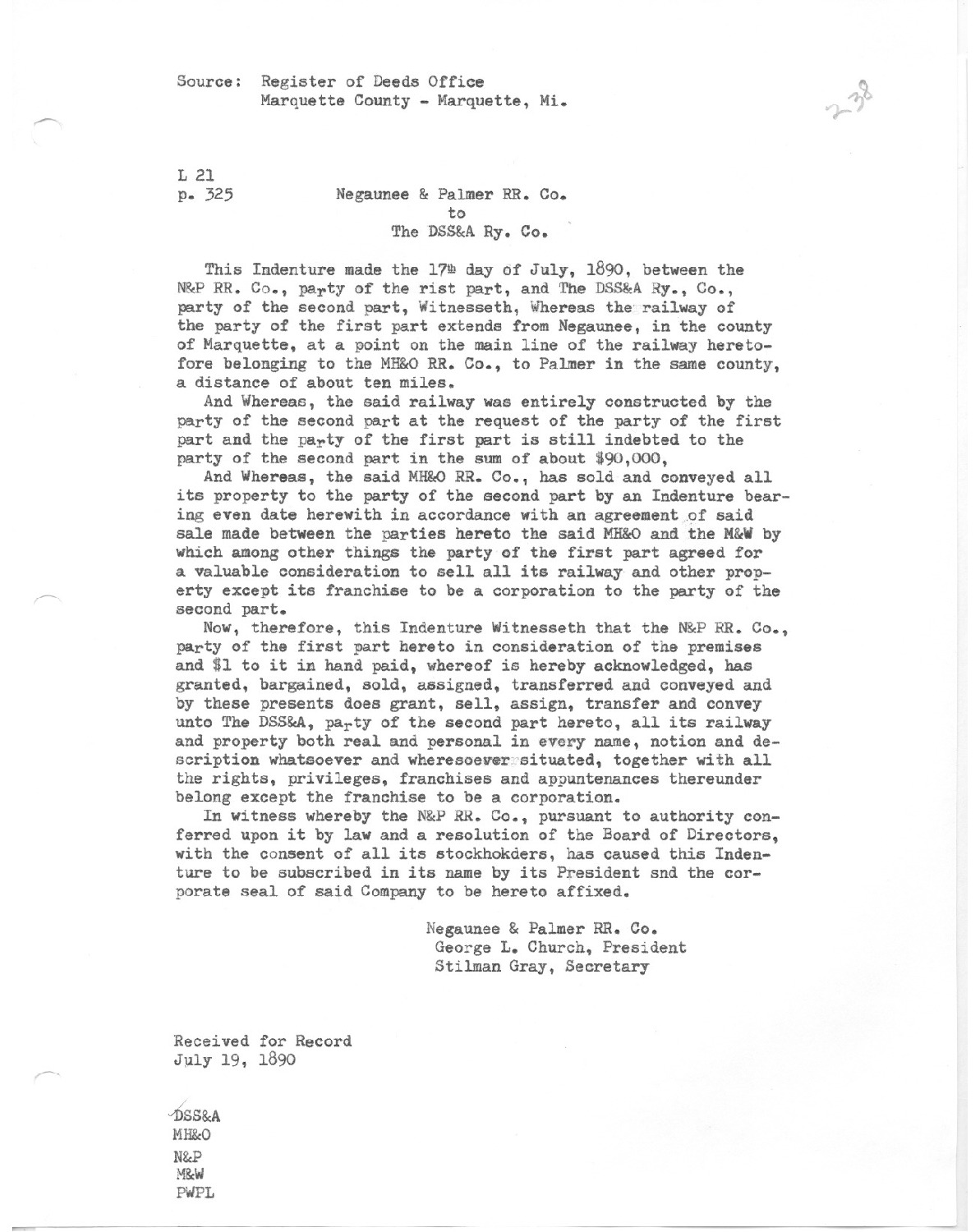 This indenture made the 17th day of July 1890 between the Negaunee & Palmer Railroad, party of the first part, and the DSS&A Railroad Company, party of the 2nd part.