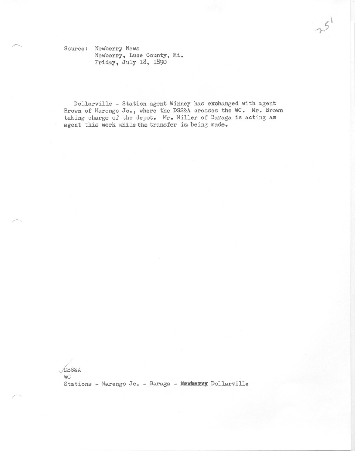 Station agent Wnney has exchanged with agent brown of Marengo Jc. Where the DSS&A crosses the WC. Mr. Brown taking charge of the depot. Mr. Miller of Baraga is acting as agent this week while the transfer is being made.