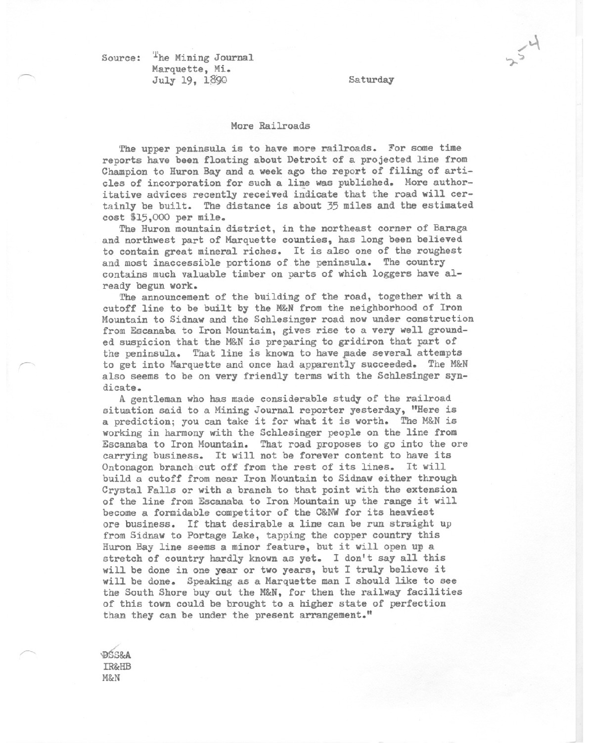 The Upper Peninsula is to have more railroads. For some time reports hae been floating about Detroit of a projected line from Champion to Huron Bay and a week ago the report of filing of articles of incorporation.