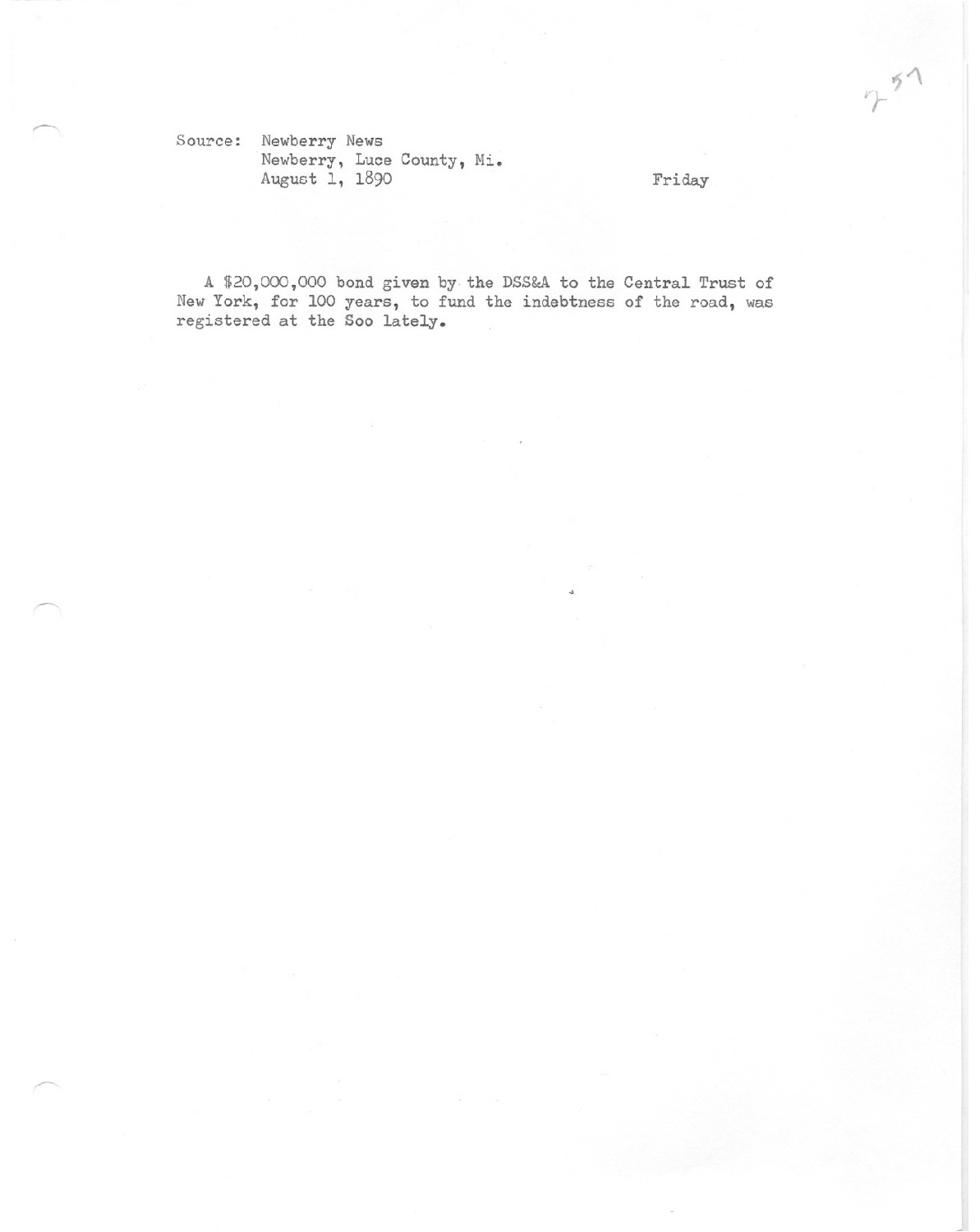 20,000 bond given by the DSS&A to the Central Trust of New York, for 100 years, to fund the indebtness of the road, was registered at the Soo lately.