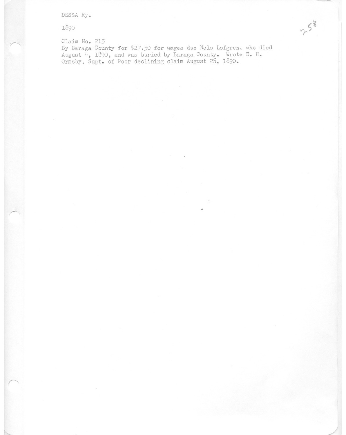 By Baraga county for $27.50 for wages due Nels Lofgren who died August 4, 1890 and was burnied by Baraga County. Wrote E. H. Ormsby superintendent of poor declining. August 26, 1890.
