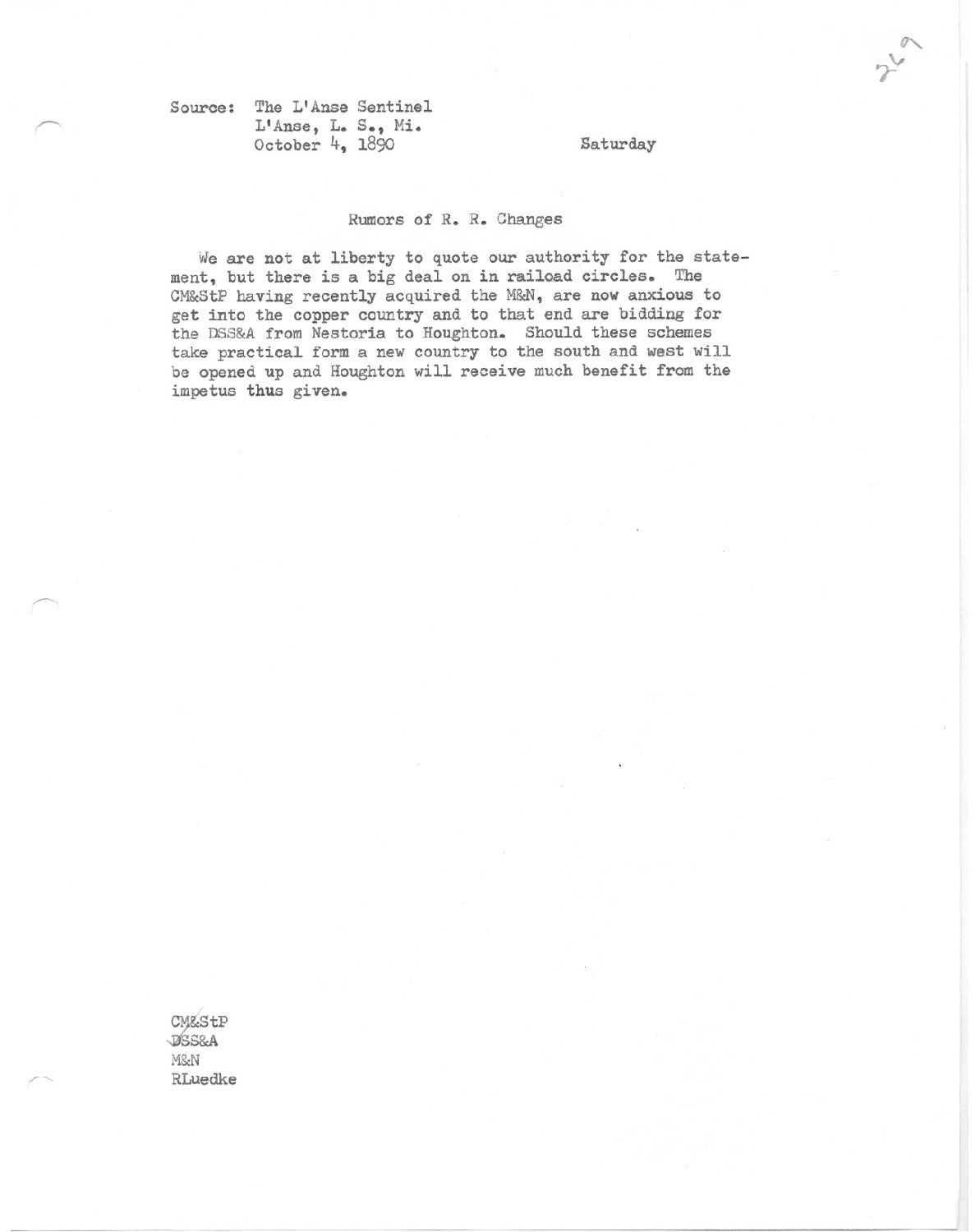 We are not at liberty to quote our authority for the statement, but there is a big deal on in railroad circles. The CM&StP having recently acquired the M&N are now anxious to get into the copper country and to that end are bidding for
