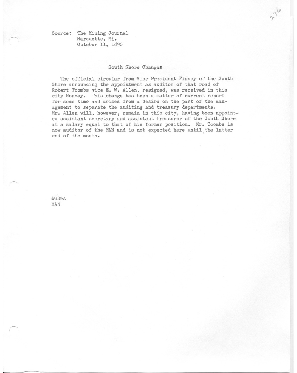 Offical circular from Vice President Finney of the South Shore announcing the appointment as auditor of that road of Robert Toombs vice E. W. Allen, resigned as received in this city Monday.