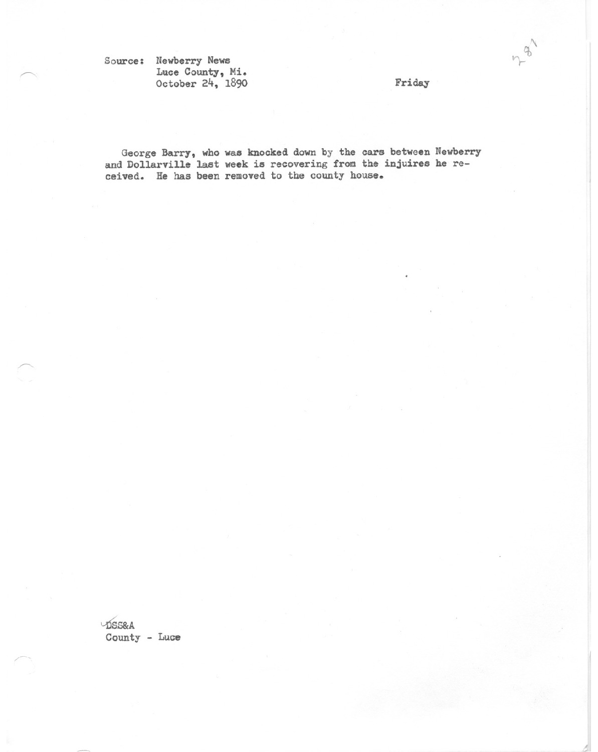 George Barry who was knocked down by the cars between Newberry and Dollarville last week is recovering from the injuries he received. He has been removed to the country house.
