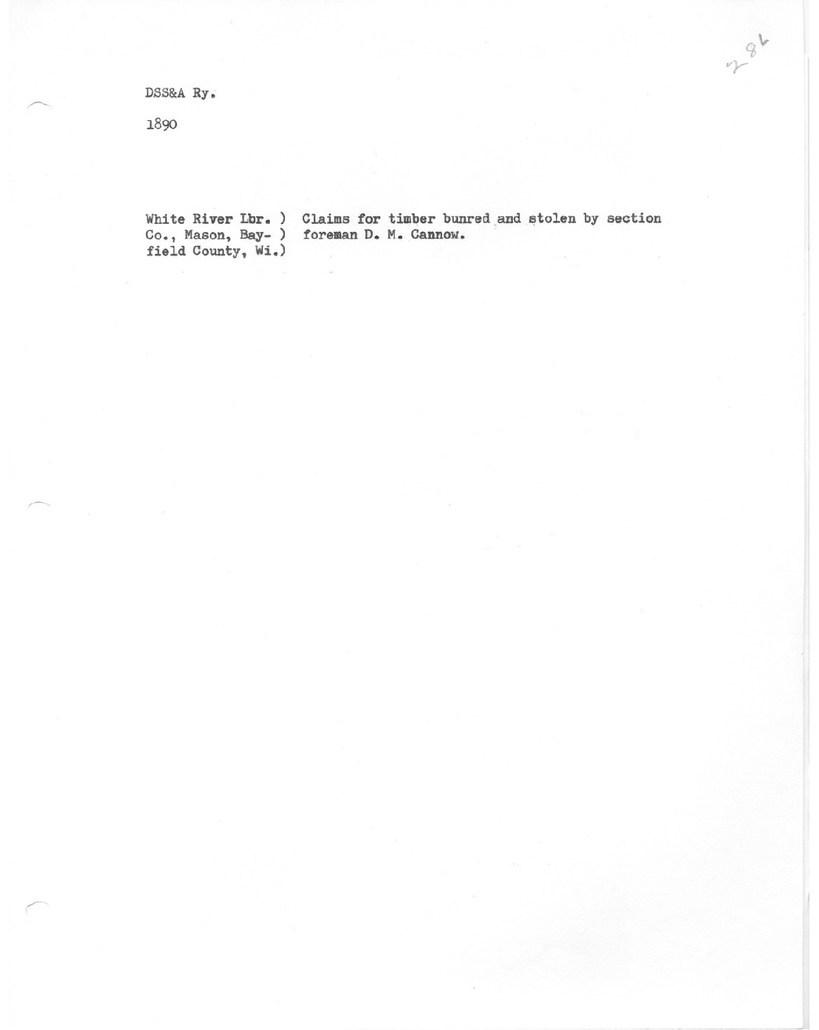 White River Lbr Company, Mason Bayfield County Wiscons. Claims for timber burned and stolen by section foreman D. M. Cannon.