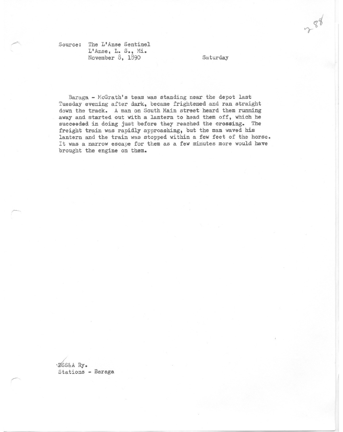 McGrath's team was standing near the depot last Tuesday evening after dark, become frightened and ran straight down the track. A man on South Main street heard them running away and started out with a lantern to head them off.