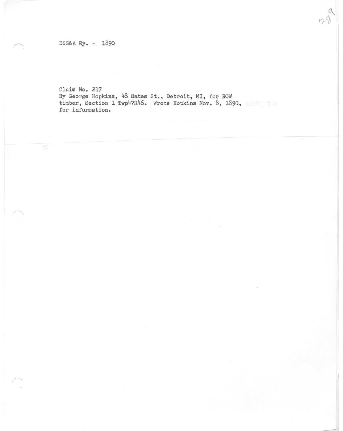 George Hopkins, 48 Bates Street, Detroit, Michigan for ROW timber, Section 1 T47R46. Wrote Hopkins Nov. 8, 1890, for information.