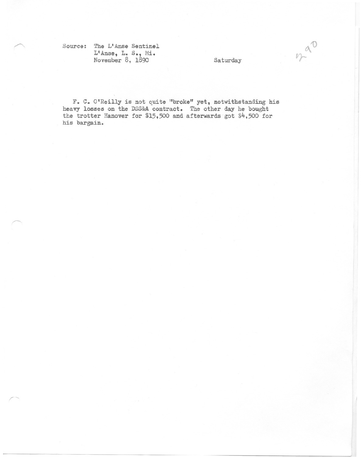 F. C. O'Reilly is not quite broke yet, notwithstanding his heavy losses on the DSS&A contract. The other day he bought the trotter Hanover for $15,500 and afterwards got $4,500 for his bargin.