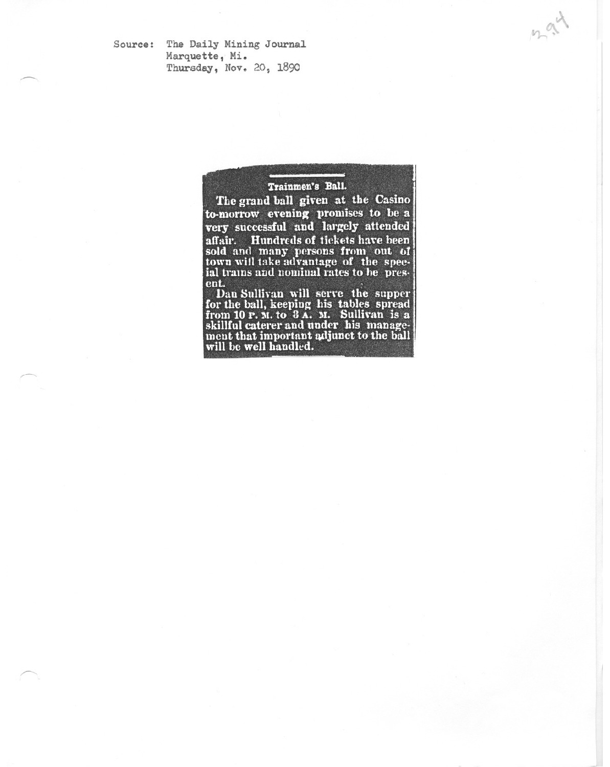 The grand ball given at the Casino tomorrow evening promies to be a very successful and largely attended affair. Hundreds of tickets have been sold and many persons from out of town will take advantage of te special trains and nominal rates to be present. Dan Sullivan will serve the supper for the ball, keeping his tables spread from 10:00pm to 3:00am. Sullivan is a skilled caterer and under his management that important adjunet to the ball will be well handled.
