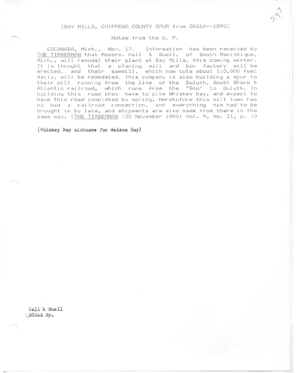 Escanaba Michigan Information has been recieived by the Timberman that Messers. Hall & Buell of this coming winter. It is thought that planting mill and box factory will be erected and their sawmill which now cuts about 110,000 feet daily will be remodeled.