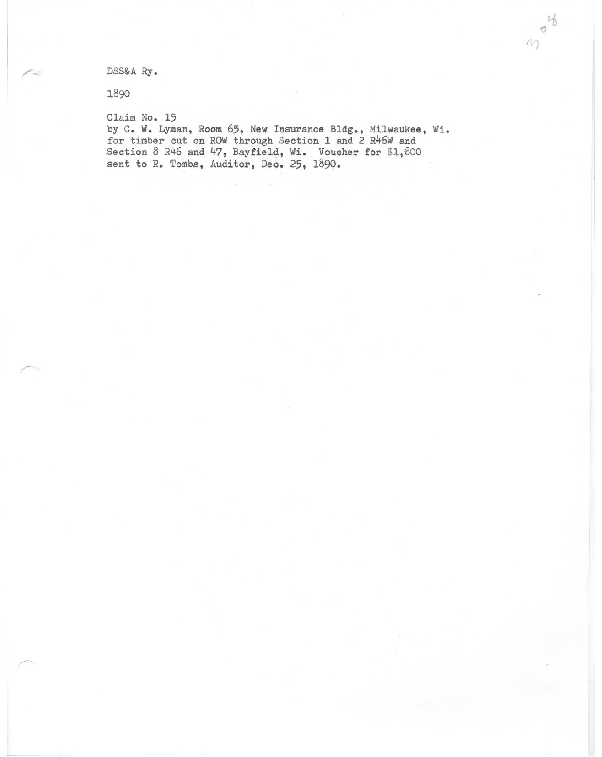 C. W. Lyman Room 65, New Insurance Building, Milwaukee Wisconsin for timber cut on Row through Section 1 and 2 R46W and Section 8 R46 and 47 Bayfield Wisconsin. Voucher for 1,800 sent to R. Tombs, Auditor December 25, 1890