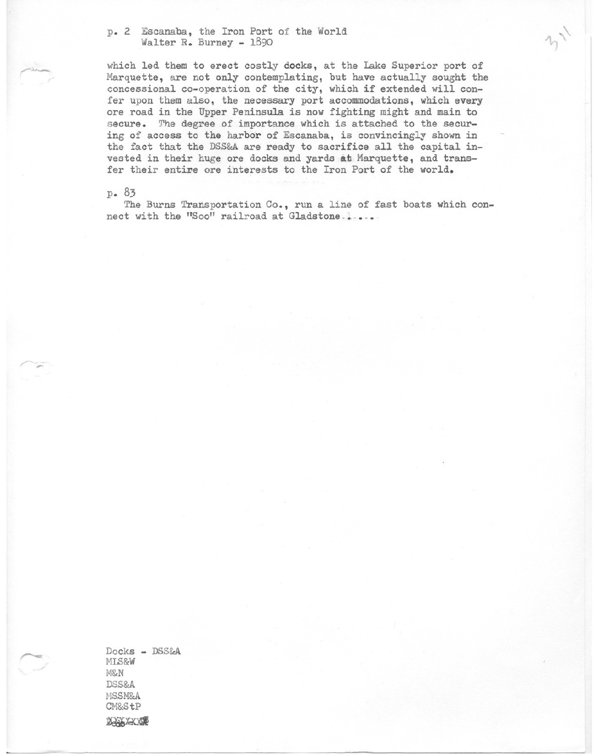 Page 64: All ready one road has obtained the desired ingress. Page 65: In addition to the facilities offered by the Schlesinger road, the N&NW will, it is stated eventually absorb the Milwaukee, Lake Shore & Western which connects after traversing a rich ore region. Page 83: Burns Transportation Company will run a line of fast boats which connect with the Soo railroad at Gladstone.