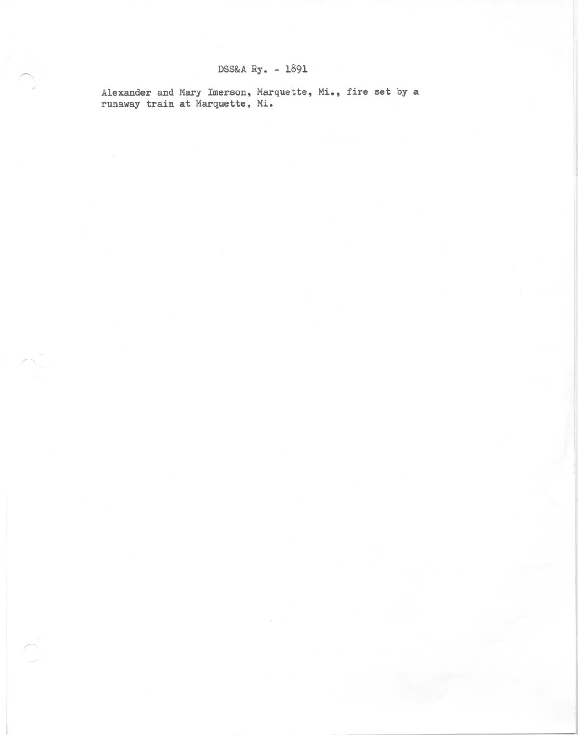 Alexander and Mary Imerson Marquette Michigan, fire set by a runaway train at Marquette, Michigan.