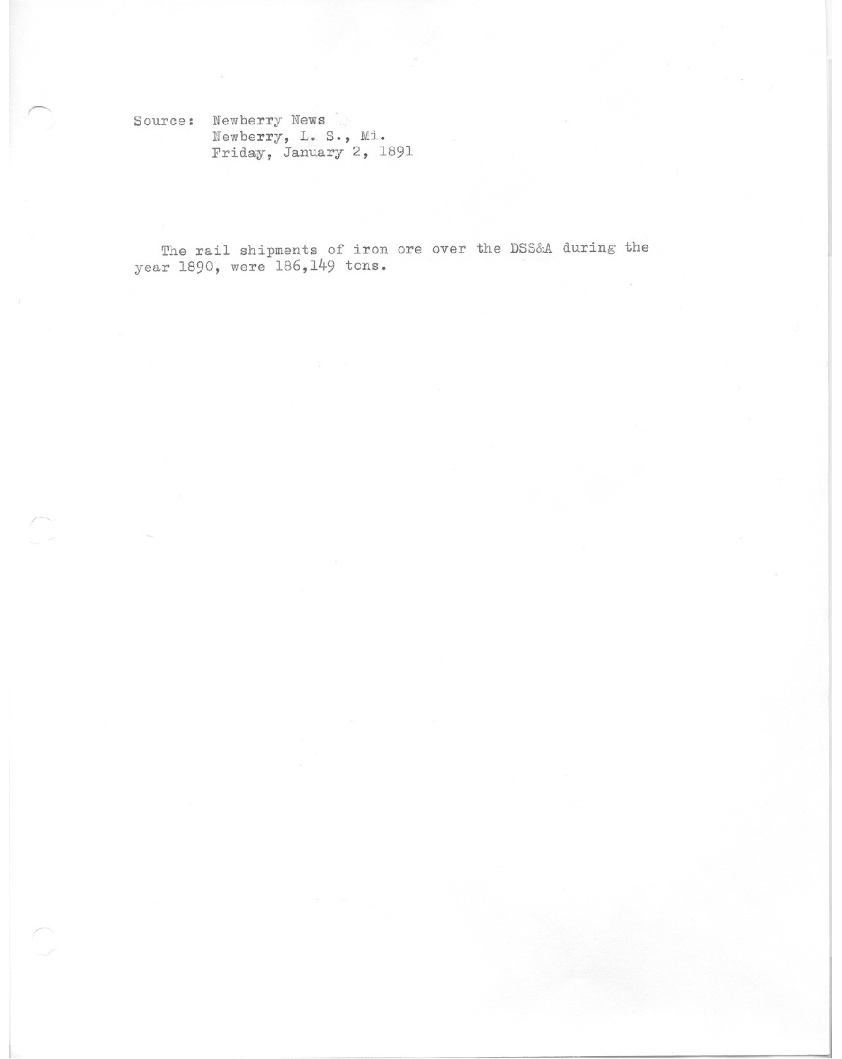 Rail shipments of Iron Ore over the DSS&A durning the year 1890 were 186,149 tons.